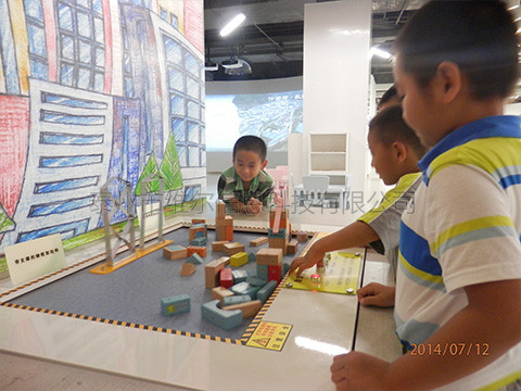 抗震及普通的建筑模型 地震演示臺上有3個按鈕,分別代表3個不同的地震的震級。地震波由地震起動設備提供,當按動某一個震級的按鈕時,演示臺就會按照該震級的震動幅度震動。對震動臺上的物體產生相應的破壞。 觀眾自行搭建房屋積木,完成后選擇地震等級按鈕,不同地震等級按鈕有不同震動強度。磚混結構、框架結構房屋、普通砌體抗震效果得以體現,從而讓參與者了解三種房屋結構,哪種更抗震。