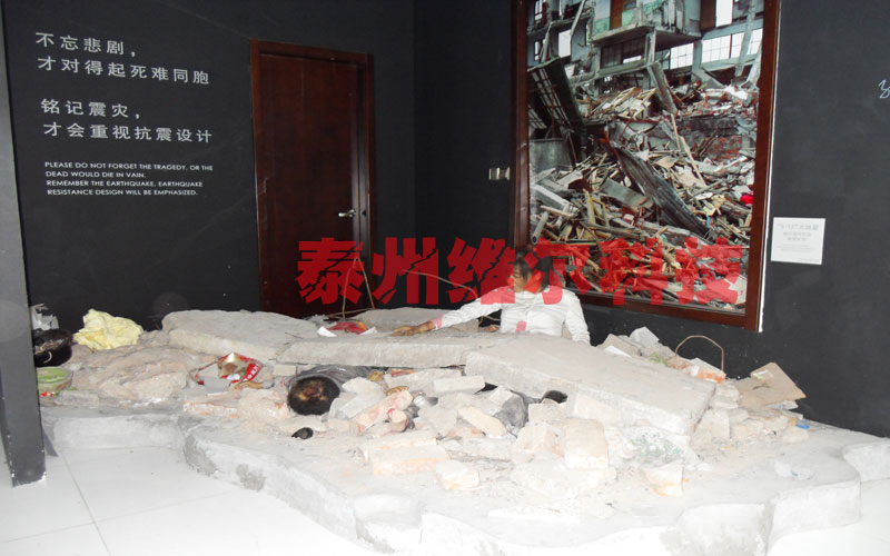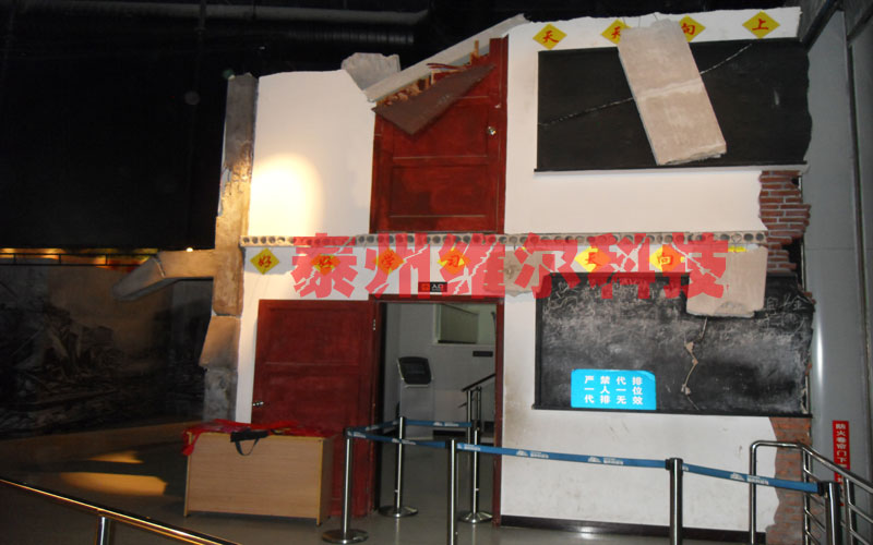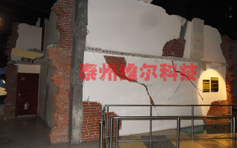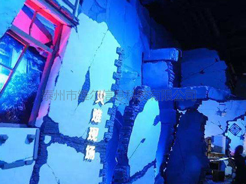 產品名稱:地震廢墟場景 產品介紹:地震廢墟造型及震后破裂場景營造震后殘破效果,由一座3維空間的地震廢墟場景造型,通過對展廳傾斜墻的利用,由墻面、地面及頂面構造出一個震后殘破的建筑,給人以震撼的視覺效果;