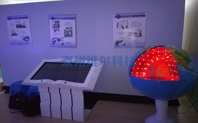 地球內部構造聲光電版 采用直徑1m地球儀北半球1/8對開,移動半球展示地殼、地核、軟流層、上地幔、下地幔,按下相關按鈕,發光顯示并伴有同步語音介紹。