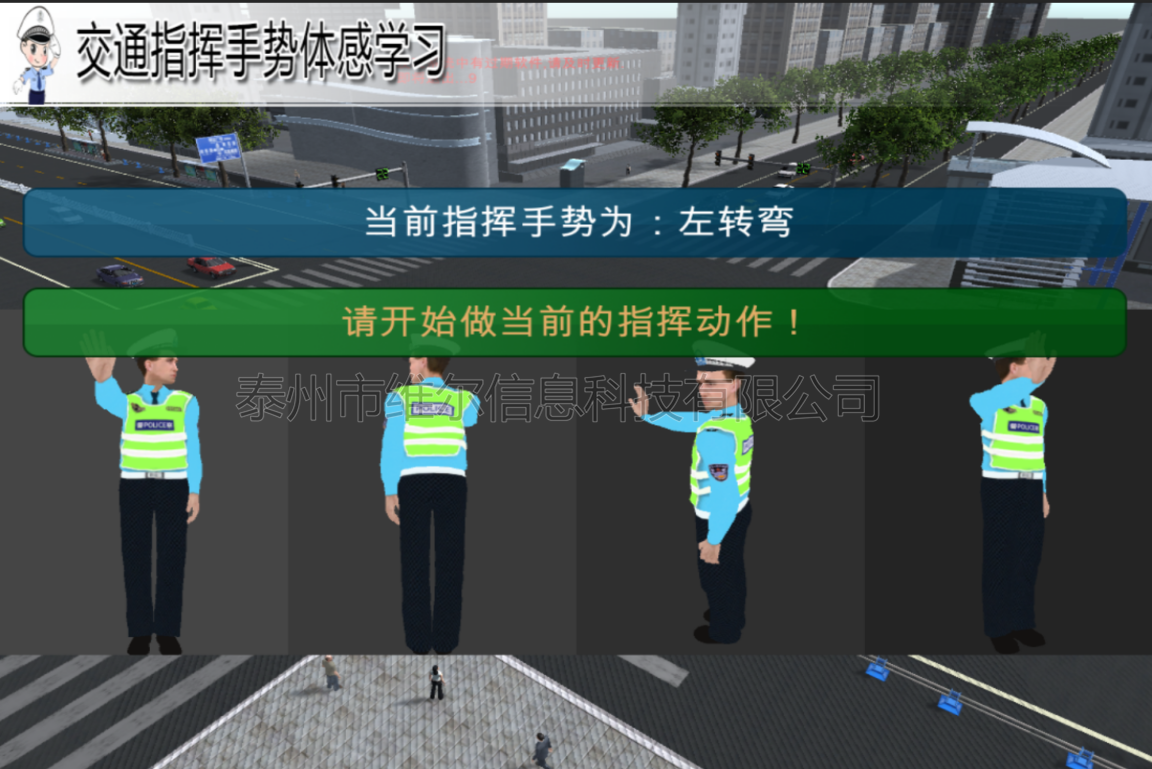 該系統(tǒng)是采用虛擬影像技術(shù),加入即時摳像功能,實現(xiàn)交通警察手勢指揮交通的全息展示。顯示屏直立入口處,畫面顯示穿著制服的交通警察,無人走過時,畫面為交通警察面帶微笑靜止不動,當(dāng)有人走過或靠近時,交通警察會根據(jù)紅綠燈信息做相應(yīng)手勢指揮交通。 交警指揮手勢模擬游戲 游戲開始時,畫面上卡通交警依次顯示做指揮手勢的畫面,分別是:左轉(zhuǎn)彎、停止、左轉(zhuǎn)彎等待、右轉(zhuǎn)彎等待、右轉(zhuǎn)彎、變道、減速、靠邊停車、直線,同時會有相應(yīng)語音提示。體驗者在感應(yīng)區(qū)域中模擬交警的手勢,同時程序會通過kinect去識別,在規(guī)定的時間內(nèi)依次完成模擬進(jìn)行手勢學(xué)習(xí),最后系統(tǒng)給出評分。每一輪游戲結(jié)束間隔5秒后,系統(tǒng)會自動開始下一輪游戲。